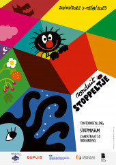 Affiche van de tentoonstellingElke ochtend staat Stoppeltje op, spurt hij naar het toilet waar de wc-bril natuurlijk veel te groot is voor zijn kleine billen, verorbert vlug zijn ontbijt, geeft zijn mama een dikke kus en…